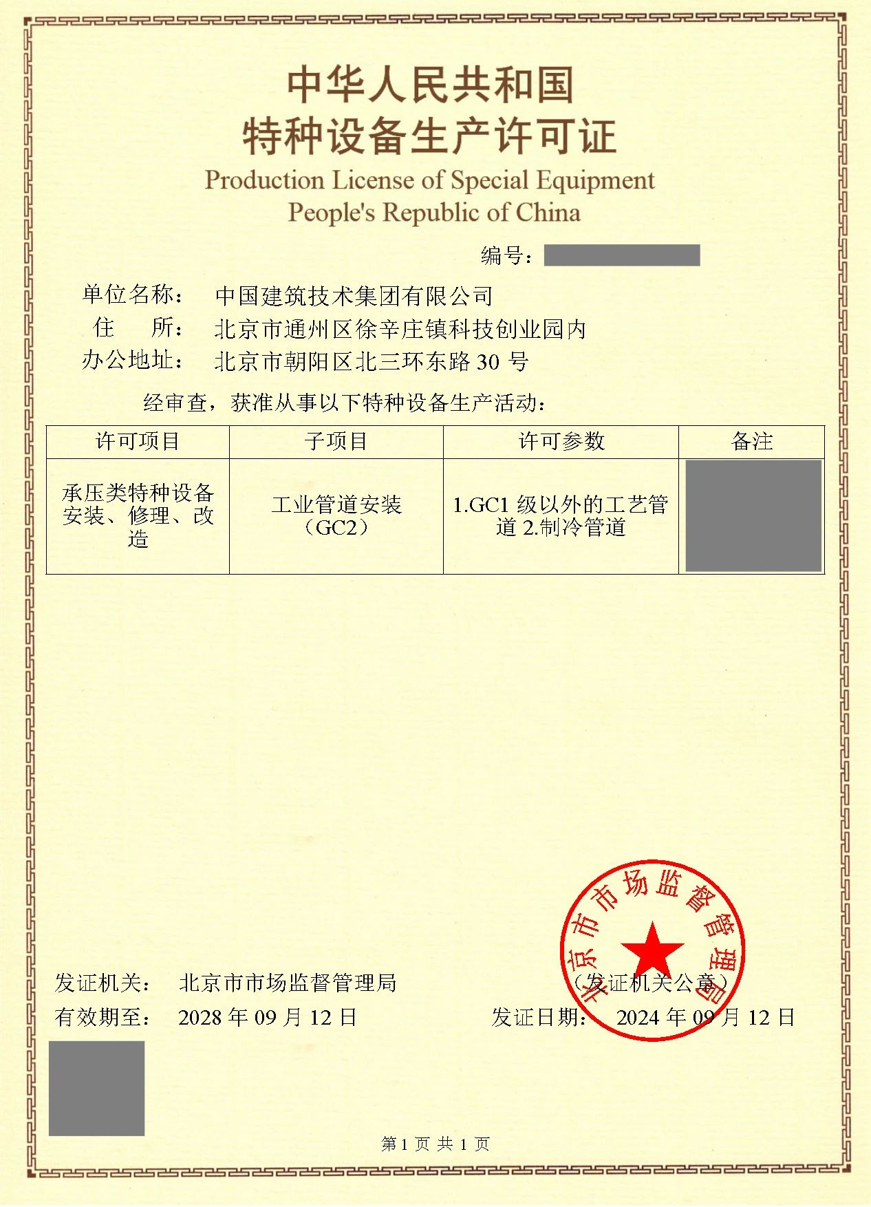 9月12日,經(jīng)北京市市場監(jiān)督管理局審核通過,中國建技成功取得“特種設(shè)備(GC2級工業(yè)管道安裝)生產(chǎn)許可證”。工業(yè)管道安裝(GC2級)生產(chǎn)許可證主要適用于承壓類特種設(shè)備的安裝、修理和改造。