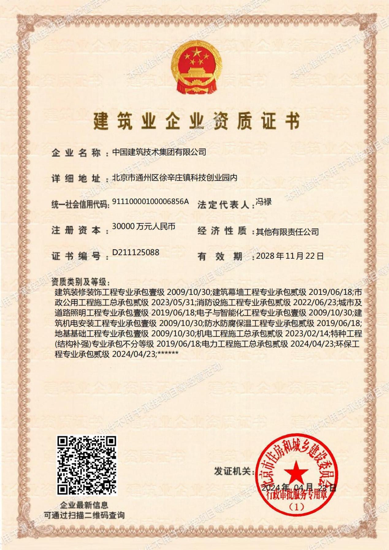 近年來,中國(guó)建技致力于完善資質(zhì)平臺(tái)建設(shè),形成了覆蓋規(guī)劃、勘察、設(shè)計(jì)、施工、監(jiān)理、咨詢、檢測(cè)與服務(wù)等領(lǐng)域的全產(chǎn)業(yè)鏈資質(zhì)矩陣。勘察設(shè)計(jì)領(lǐng)域,擁有工程勘察專業(yè)類(巖土工程)甲級(jí)、建筑行業(yè)(建筑工程)甲級(jí)、風(fēng)景園林工程設(shè)計(jì)專項(xiàng)甲級(jí)、城鄉(xiāng)規(guī)劃編制甲級(jí)、土地規(guī)劃乙級(jí)、測(cè)繪工程測(cè)量乙級(jí)、勞務(wù)類(工程鉆探)乙級(jí)等多項(xiàng)資質(zhì);工程施工領(lǐng)域,擁有建筑工程施工壹級(jí)、市政公用工程貳級(jí)、機(jī)電工程施工貳級(jí)、電力工程施工貳級(jí)四項(xiàng)總承包資質(zhì);鋼結(jié)構(gòu)、地基基礎(chǔ)、裝修裝飾、機(jī)電安裝、道路照明、電子與智能化等專業(yè)承包壹級(jí)資質(zhì);建筑幕墻、消防設(shè)施、防水防腐保溫等專業(yè)承包貳級(jí)資質(zhì);工程監(jiān)理領(lǐng)域,具備屋建筑工程監(jiān)理甲級(jí)資質(zhì),開創(chuàng)了以科研引領(lǐng)、設(shè)計(jì)助力、施工驅(qū)動(dòng)的一體化經(jīng)營(yíng)新局面。