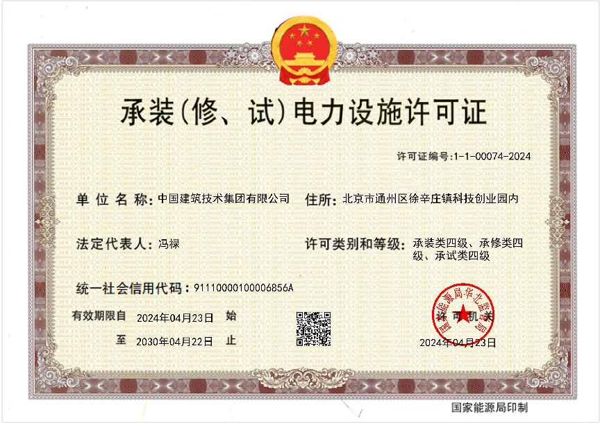 4月23日,經(jīng)北京市住房和城鄉(xiāng)建設(shè)委員會(huì)、國(guó)家能源局華北監(jiān)管局核準(zhǔn),中國(guó)建技申報(bào)的電力工程施工總承包貳級(jí)、環(huán)保工程專業(yè)承包貳級(jí)、承裝(修、試)電力設(shè)施許可證(四級(jí))三項(xiàng)資質(zhì)成功獲批。