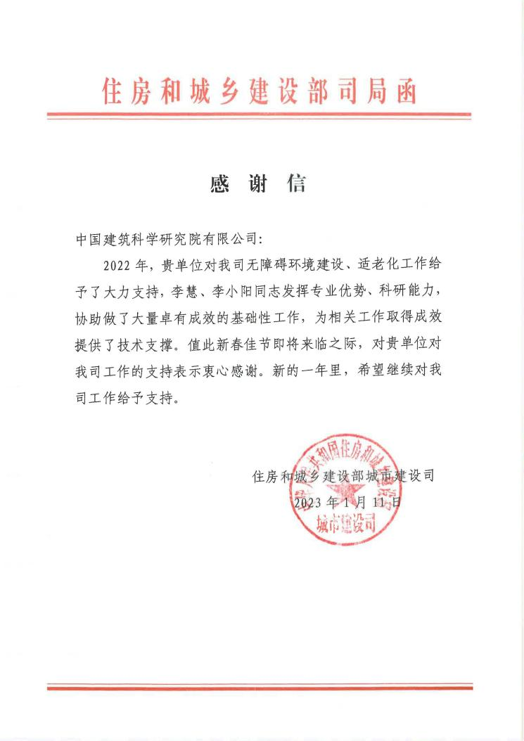 春節(jié)前夕,中國建研院收到住房和城鄉(xiāng)建設(shè)部城市建設(shè)司發(fā)來的感謝信,對中國建研院在無障礙環(huán)境建設(shè)、適老化工作給予的大力支持,及有關(guān)同志發(fā)揮專業(yè)優(yōu)勢、科研能力和取得的成效上給予肯定并表示感謝,同時希望新的一年里對住建部城建司工作繼續(xù)給予支持。