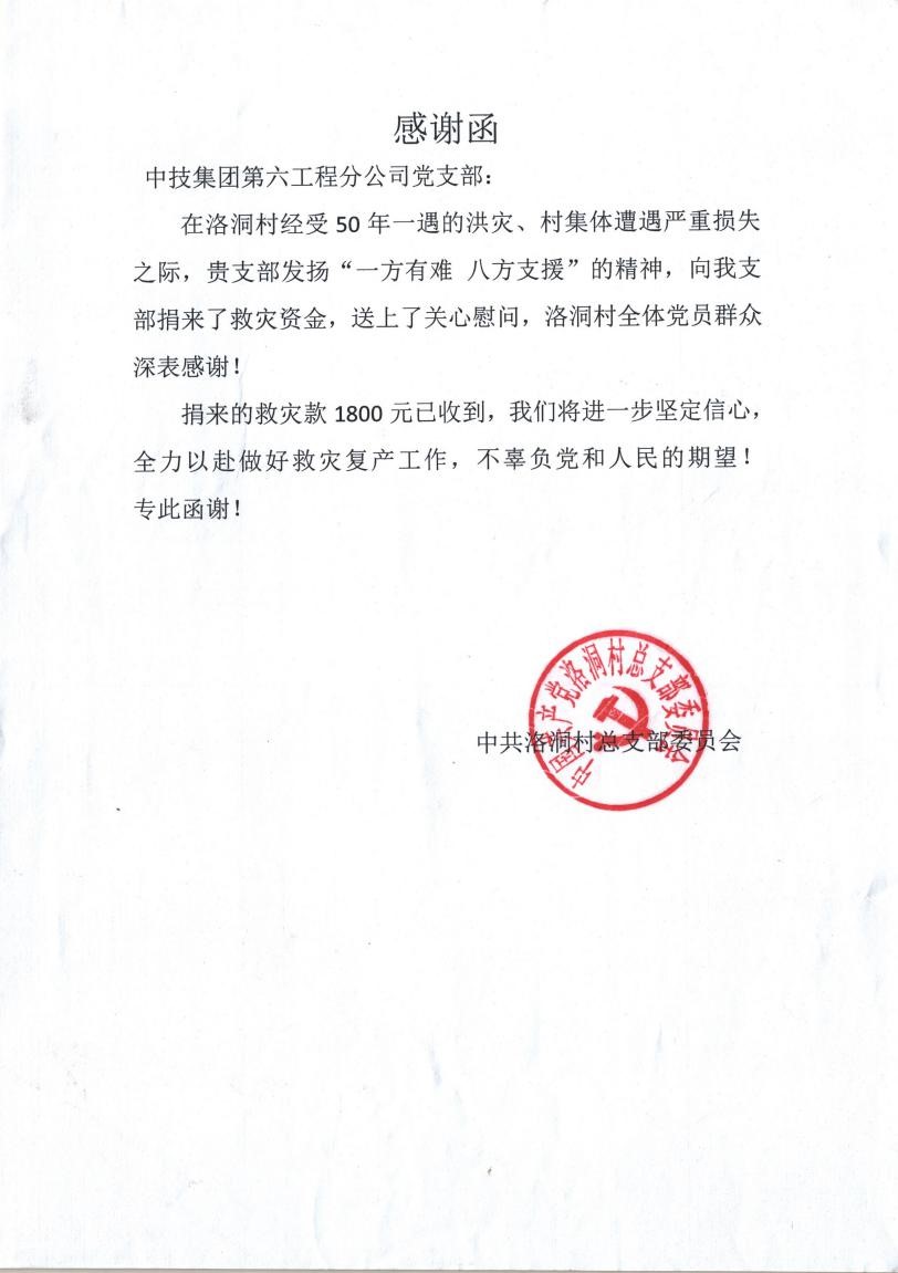 6月17日、6月23日第六工程分公司清遠(yuǎn)恒大御泉四季花園總承包項(xiàng)目部及第六工程分公司黨支部接連收到了清遠(yuǎn)市中共佛岡縣委、佛岡縣人民政府、中共洛洞村總支部委員會(huì)的感謝信,感謝信內(nèi)容主要是針對(duì)中技集團(tuán)清遠(yuǎn)恒大御泉四季花園總承包項(xiàng)目部及第六工程分公司黨支部在6月7日至6月9日清遠(yuǎn)市佛岡縣發(fā)生的50年一遇的洪災(zāi)中做出的巨大貢獻(xiàn)表示真誠(chéng)的感謝。?