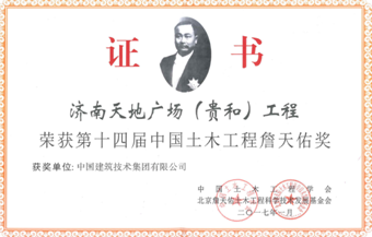 設計三所設計的濟南天地廣場(貴和)項目榮獲“第十四屆中國土木工程詹天佑獎”。中國土木工程詹天佑獎(簡稱詹天佑獎)是經(jīng)科技部核準,建設部認定,在建設部、鐵道部、交通部、水利部的共同支持與指導下,以弘揚科技創(chuàng)新精神,表彰獎勵在科技創(chuàng)新與新技術應用中成績顯著的工程項目為宗旨的獎項,是我國土木工程建設領域的最高榮譽獎。項目負責人石巍代表設計三所于2017年4月14日參加了頒獎大會。