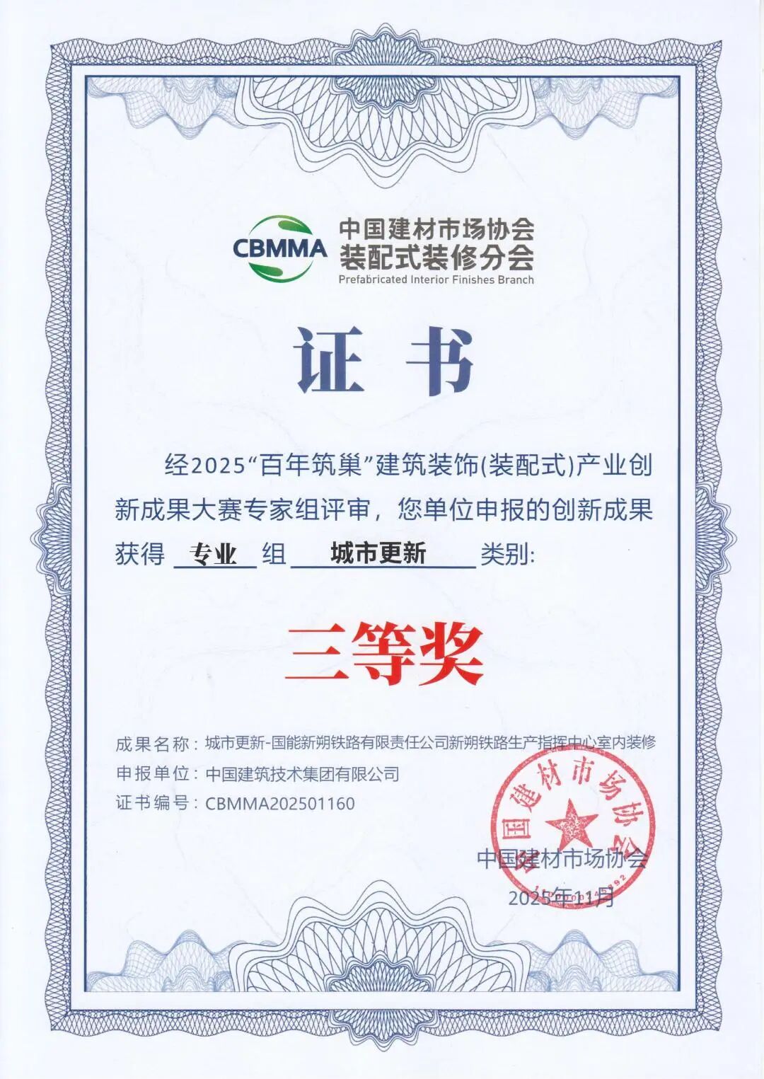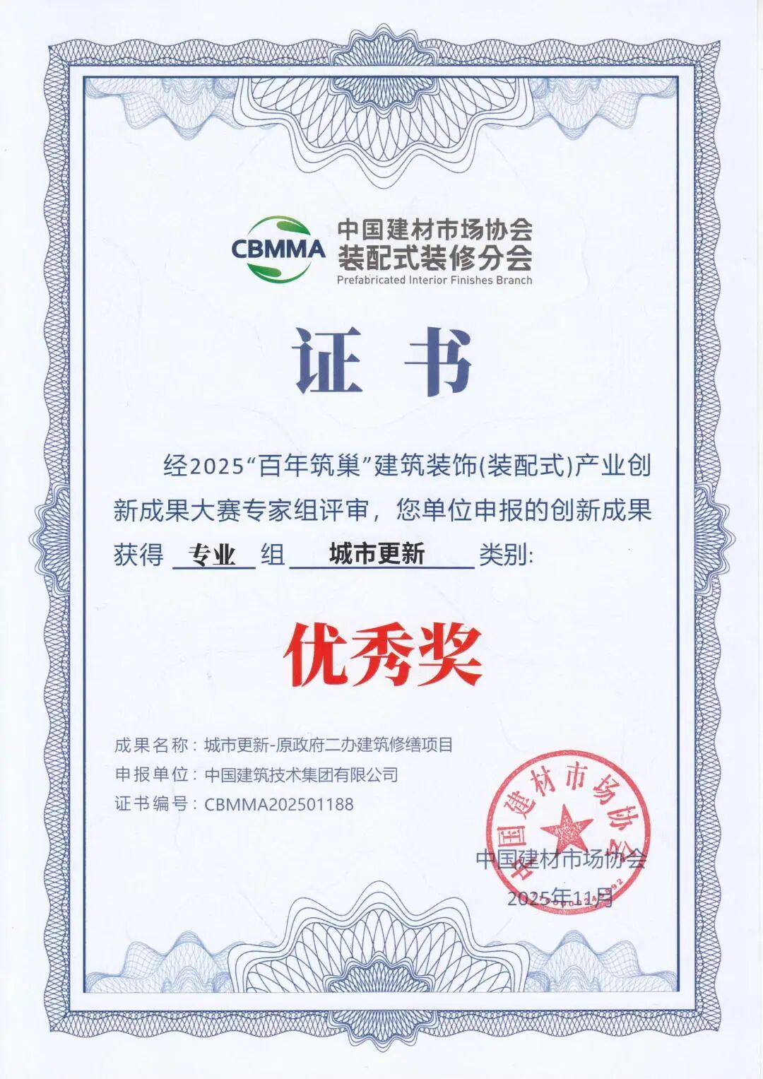 11月13日,由中國建材市場協(xié)會、中國建材市場協(xié)會裝配式裝修分會主辦的2025首屆裝配式裝修產(chǎn)業(yè)大會在浙江海寧會展中心舉行。中國建技所屬三個項目在大會同期舉辦的2025“百年筑巢”建筑裝飾(裝配式)產(chǎn)業(yè)創(chuàng)新成果大賽中獲獎。