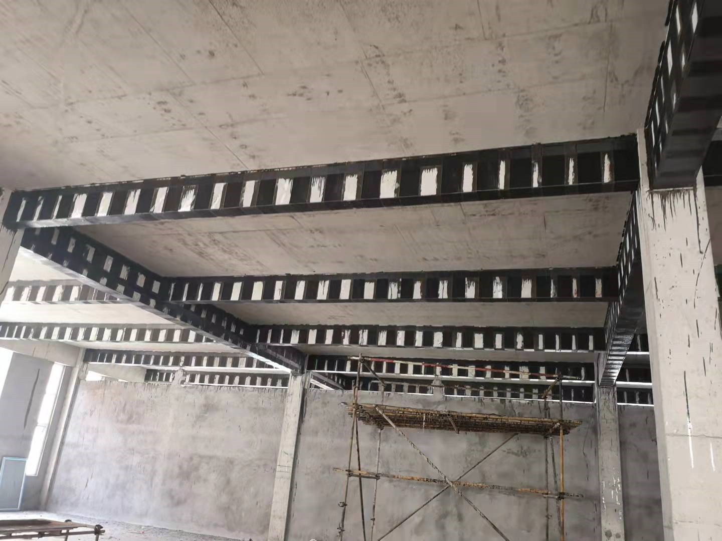 梁粘碳纖維或粘鋼:由于廠房急于交付使用,經(jīng)設(shè)計優(yōu)化,在滿足原設(shè)計荷載的情況下采用施工迅速更便捷且占用空間最小的粘鋼和粘碳纖維工藝施工。節(jié)省了約1/4的工期