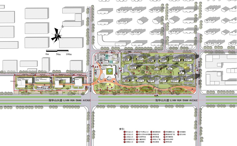 通過(guò)調(diào)研分析,提出【都市綠洲、活力天街、靈動(dòng)空間】三個(gè)設(shè)計(jì)理念,著力打造五大特色場(chǎng)景: