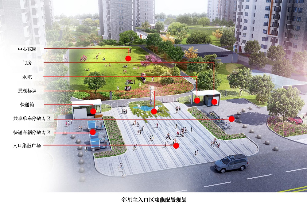 主入口實行人車分流組織,設置集散廣場、景觀標識和中心花園。精細化布局門房、快遞箱、水吧、共享單車與快遞車輛停放專區(qū),形成功能強大的新型住區(qū)入口服務系統(tǒng)。
