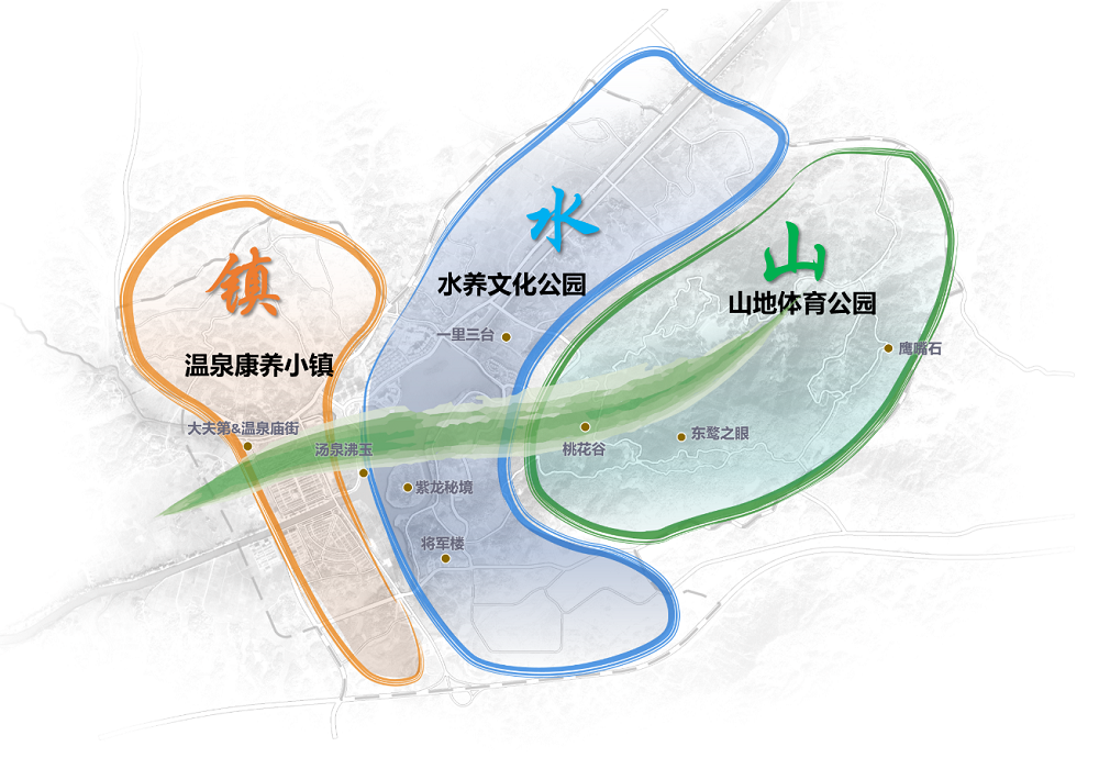 規(guī)劃形成“兩公園一小鎮(zhèn)、八景點(diǎn)一通廊”的空間結(jié)構(gòu),以紫龍湖為核心打造溫泉康養(yǎng)文化公園;結(jié)合東鶩山打造山地體育公園;結(jié)合灰湯鎮(zhèn)區(qū)打造灰湯溫泉民俗小鎮(zhèn);打“湯泉沸玉、鷹嘴石、桃花谷、將軍樓、大夫第&溫泉廟街、一里三臺、東鶩之眼、紫龍秘境”灰湯八景;依托烏江、紫龍湖、東鶩山形成山水景觀視線通廊。