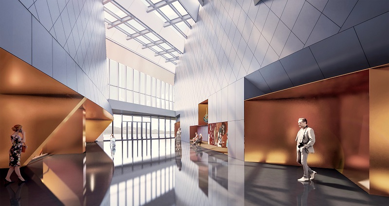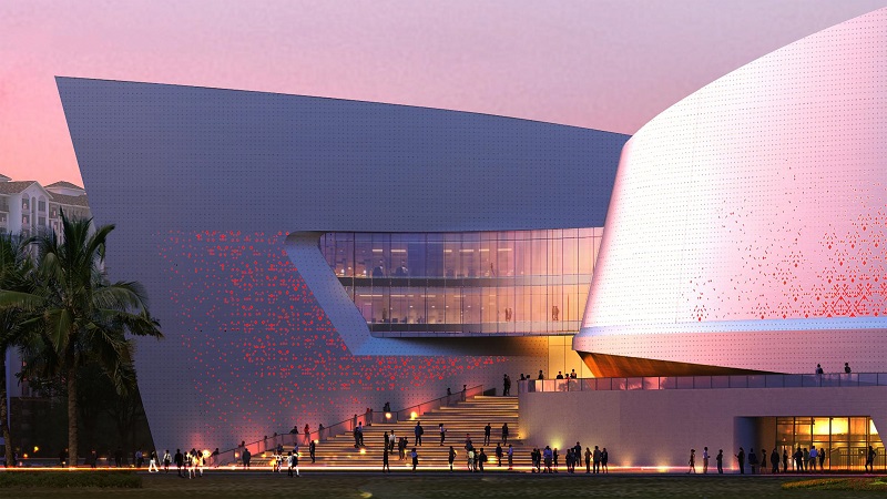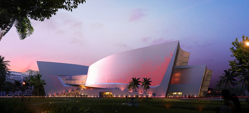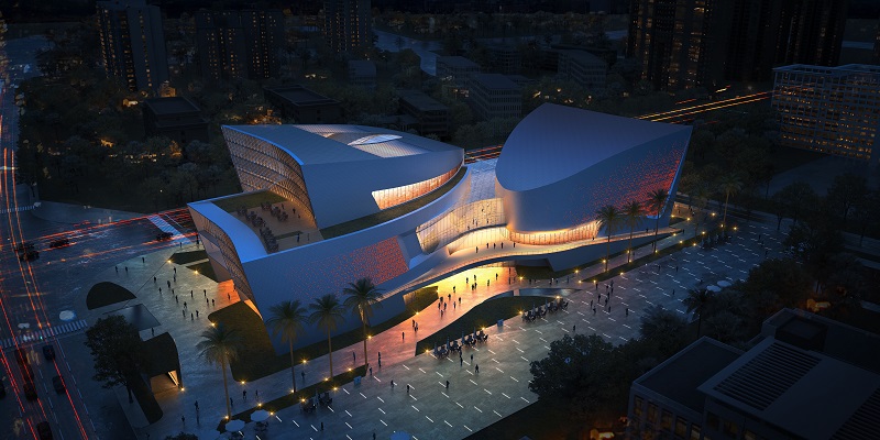 建筑方案以“海上帆、風(fēng)中翼、云上錦”為總體設(shè)計理念,采用“一體兩翼”的規(guī)劃格局,力求以鮮明獨特的建筑形象,充分展現(xiàn)在建設(shè)自貿(mào)港這一新時代背景下海南地域文化的“展示與弘揚、傳播與交流、騰飛與發(fā)展”。整體建筑造型如海上揚帆的造型高低錯落呼應(yīng),建筑形體面向東側(cè)城市廣場開敞,又如張開的親和雙臂,將漫步人群攬入其中,把從西北西南街角引入的城市人群,會聚于建筑中心設(shè)有共享、咖啡、新聞發(fā)布等休閑互動區(qū)的“城市文化客廳”,并將建筑空間自然劃分為南北兩翼,即位于北側(cè)的瓊劇會館劇場與南側(cè)的非遺藝術(shù)博物館區(qū),宛如展翅欲飛的“風(fēng)中雙翼”,迎海上來風(fēng)。