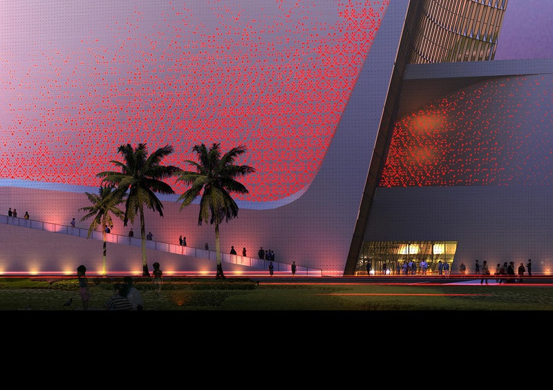 建筑外飾面以穿孔金屬幕墻及玻璃幕墻為主,強調(diào)建筑虛實對比,造型整體舒展大氣,極具動態(tài)。建筑立面注重細部處理,淺銀灰色金屬質(zhì)感的菱形穿孔鋁板,以若干通透率的組合,拼接成漸變過渡的視覺效果,細節(jié)融入海南黎錦圖案意象,寓意地域非遺傳統(tǒng)文化的精髓。鋁板開孔圖案襯以夜景燈,晝間夜間將呈現(xiàn)不同的立面效果。