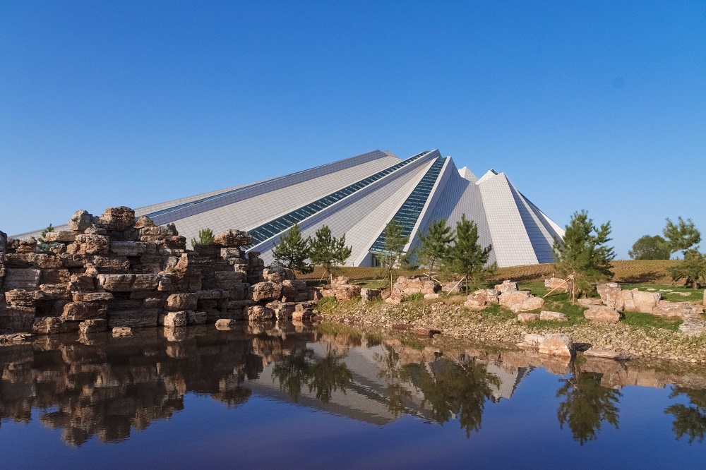 整體建筑的文化意義在于以平面形態(tài)和布局,體現(xiàn)成吉思汗開創(chuàng)的歐亞大陸版圖,并以鄂爾多斯為中心,向十三個(gè)方向發(fā)散的十三條建筑軸線代表十三世紀(jì)以及成吉思汗創(chuàng)建的十三個(gè)世界之最,象征著成吉思汗對(duì)于整個(gè)時(shí)代帶來(lái)的震撼。