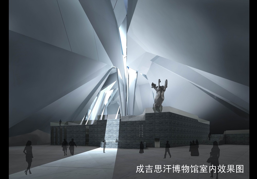 頂部的采光帶,以及鏤空處光影的引入,豐富了室內(nèi)的空間,象征萬(wàn)里浩瀚的星空,將人們的思緒帶到遙遠(yuǎn)的年代,有棱角的折面,表現(xiàn)了成杰思汗時(shí)代的力量。
